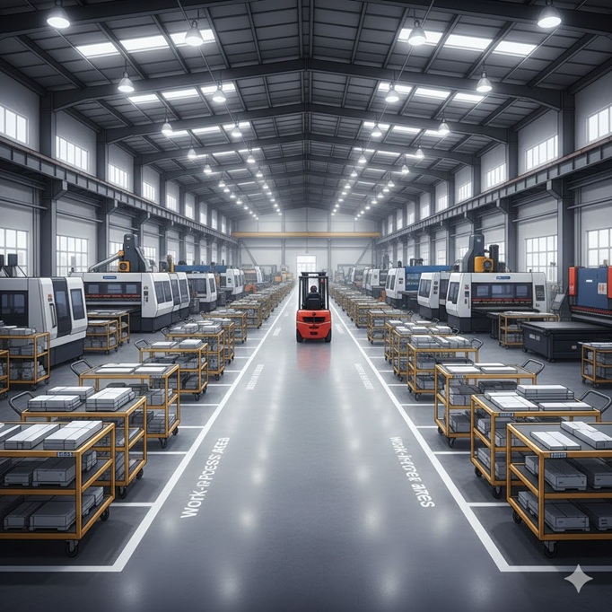 新工場の設計では、各工程の間に、あらかじめ「次に加工するものを置くエリア」と「加工が終わったものを置くエリア」を明確に確保します。目安として、工場床面積の約30%をこれらの「滞留・通路スペース」として最初から割り当てる勇気が必要です。これにより、通路が塞がれるストレスのない、整然とした現場が維持されます。